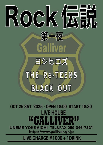 『ロック伝説 第一夜』 2025. 10/25(土) open 18:00 / start 18:30 チャージ¥1000(飲食代別途要) ヨシヒロズ / THE Re-TEENS / BLACK OUT |