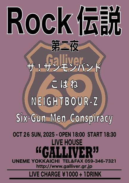『ロック伝説 第二夜』 2025. 10/26(日) open 18:00 / start 18:30 チャージ¥1000(飲食代別途要) ザ!サンモンバンド / こばね / NEIGHBOUR-Z / Six-Gun Men Conspiracy |