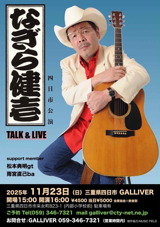 『 なぎら健壱 TALK & LIVE 四日市公演 』 2025. 11/23(日)open 15:00 / start 16:00 前売¥4500 当日¥5000 (飲食代別途要) supportmember: 松本典明gt 雨宮直己ba 制作協力:MUSIC FIELD 全席自由 チケット予約開始 9/1(月) チケットご予約につきましては下記URLからご参照ください。 http://www.galliver.gr.jp/yoyaku.html | ![]() |